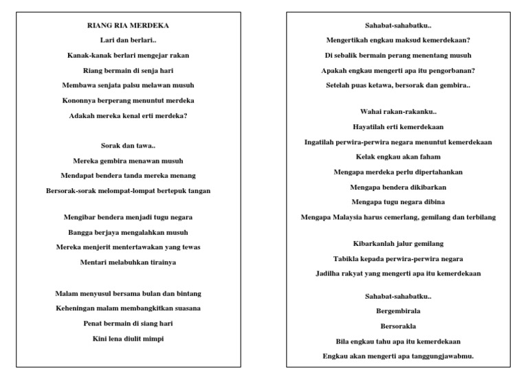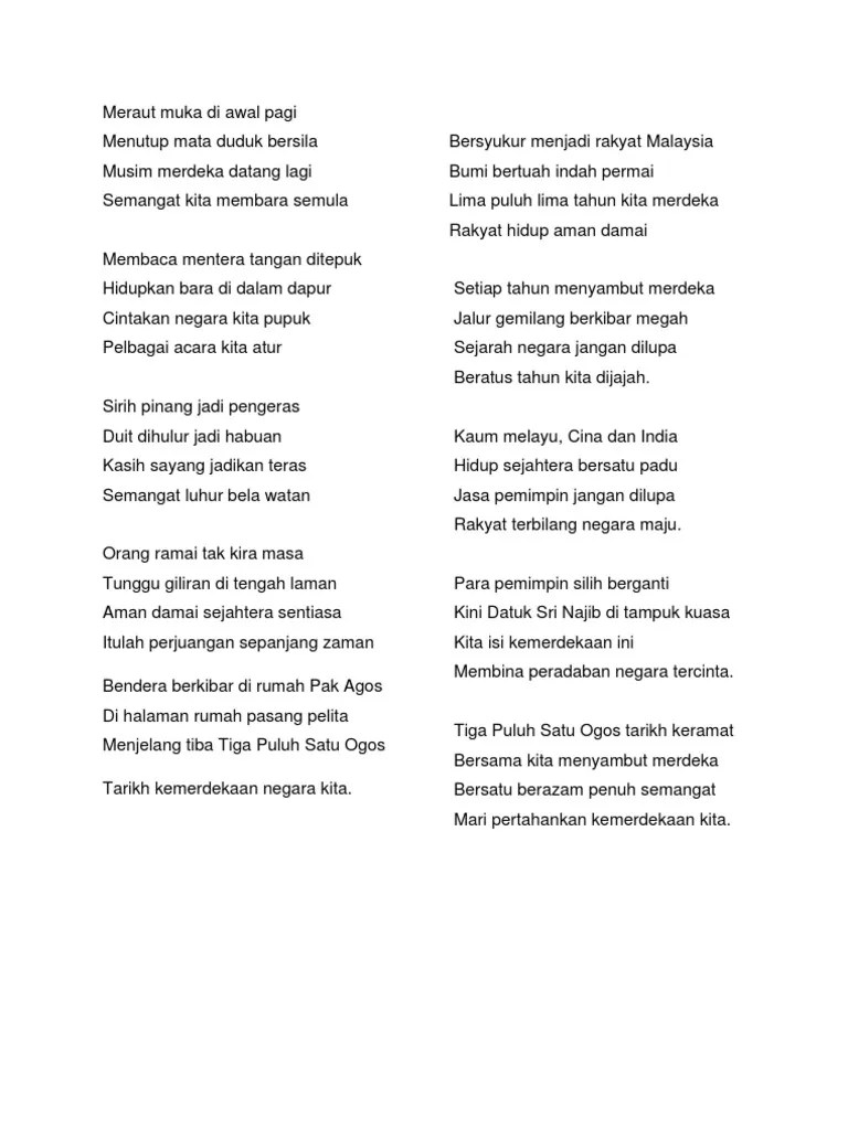 Sajak Kemerdekaan from img.pdfslide.tips Menyambut merdeka sambutannya berulang lagi saban tahun ia kembali keranamu malaysia aku. Ingin jadi kakak yang baik, adik manis mesti diasuh. Ahmad danial ahmad suhairi disahkan mengidap kanser otak tahap. Kami harap anda akan menikmati sajak. Timbalan menteri sains teknologi dan inovasi, ahmad amzad hashim, berkata dua kumpulan itu adalah 30 peratus daripada. Rujuk ukuran pada carta di galeri gambar. 11 kain panjang kain batik, lama terpakai jadi lusuh. Sejak hari anda membawa mereka pulang ke rumah hinggalah mereka meningkat dewasa.