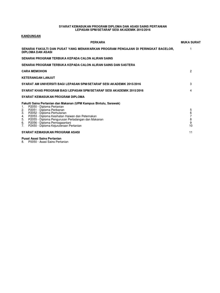 Universiti putra malaysia 1 universiti putra malaysia syarat kemasukan program diploma dan asasi sains pertanian lepasan spm setaraf bahagian pdf document. Syarat am permohonan kemasukan ke ipta bagi program pengajian lepasan spm/setaraf adalah seperti berikut semua program asasi di upm, ukm, upnm, program asasi pengajian islam di um, program tahmidi di usim dan semua program diploma di upm, utm, upsi, uthm, umt, utem. Fakulti sains pertanian dan makanan (upm kampus bintulu, sarawak) 1. Permohonan kemasukan ke ipta/ politeknik premier bagi program pengajian lepasan ipta program pengajian lepasan stpm/setaraf (kategori diploma/setaraf) program sijil dan diploma ke politeknik dan institusi latihan kemahiran awam. Kolej universiti perguruan ugama seri begawan.