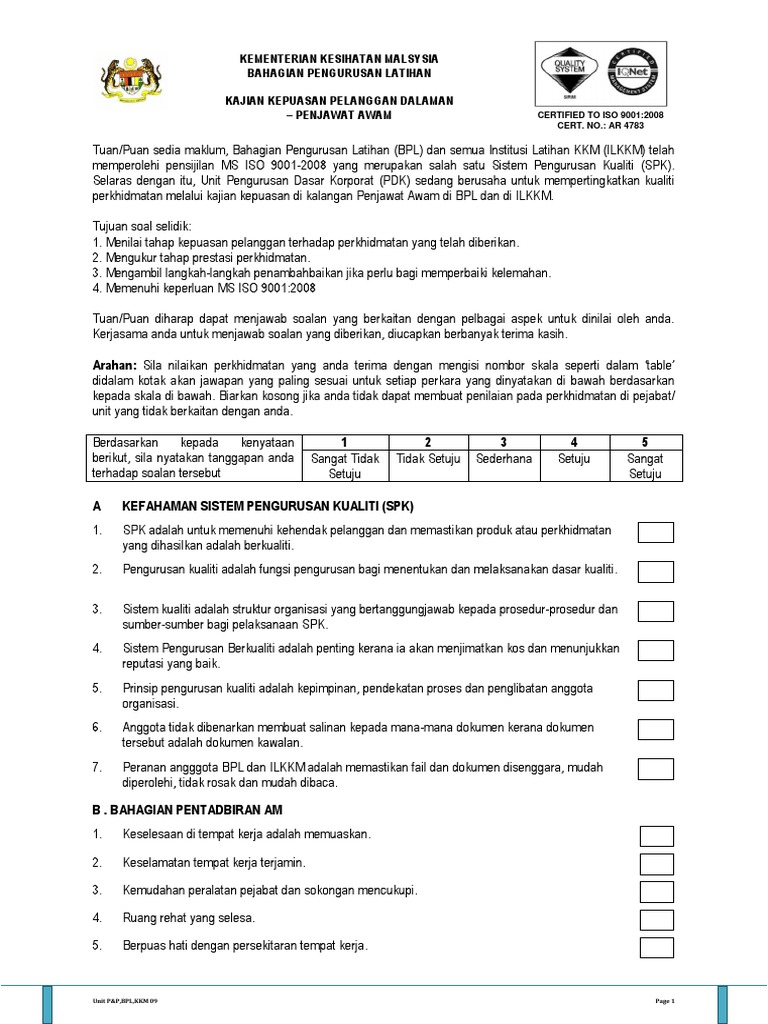 Sehubungan itu, pihak pbpp ingin menjemput anda untuk memberi maklumbalas dengan melengkapkan borang kaji selidik kepuasan pelanggan yang disediakan. Taraf pendidikan spm/stpm/sijil/setaraf diploma Soal selidik ini adalah hanya berkaitan dengan perkhidmatan kaunter unit hasil utama, hospital sungai buloh. Borang soal selidik kajian kepuasan pelanggan kementerian pelajaran malaysia. Borang soal selidik kajian kepuasan pelanggan perkhidmatan pegawai khidmat pelanggan jkn perak.
