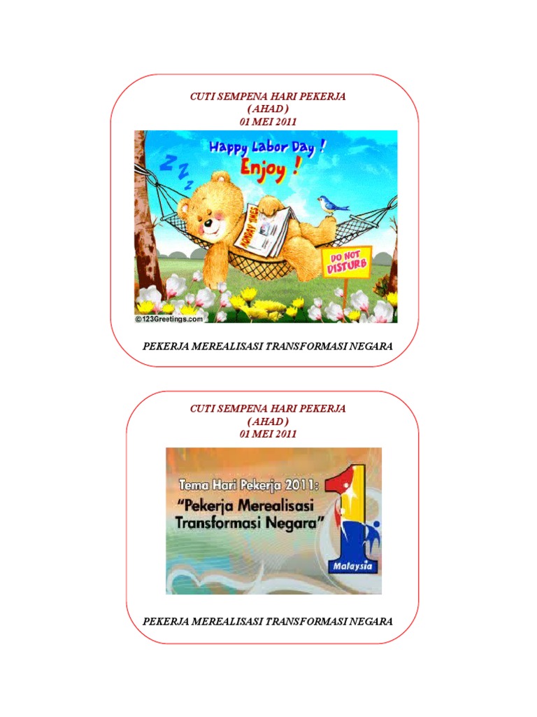 Border Cuti Sekolah from imgv2-2-f.scribdassets.com Savesave cuti hari pekerja for later. Mutiara bay, tanjung balau, desaru bayaran : 30 hari dikira sekali dengan hari cuti pekerja. Cuti umum khamis 1 mei 2014 sempena hari pekerja di malaysia. Hari pekerja di raikan setiap tahun pada 1 mei. Hari pekerja diraikan bagi menghargai jasa seorang pekerja dalam perkembangan ekonomi negara. Hari pekerja merupakan hari cuti am bagi malaysia. Kalau korang kena kerja masa cuti, korang ada hak seingat aku mereka diberi cuti selama 60 hari (tapi dengarnya nak extend ke 90 hari, kalau salah sila betulkan).