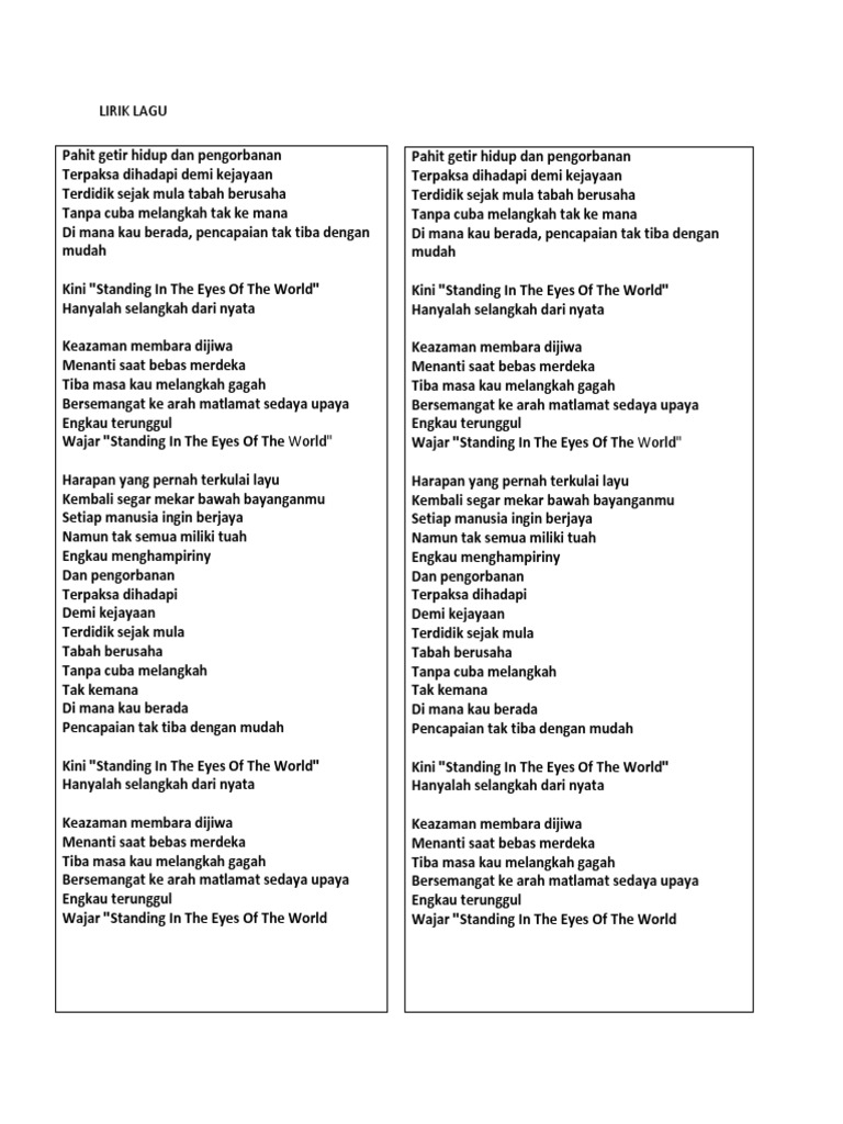 Lagu from image.slidesharecdn.com Write about your feelings and thoughts about standing in the eyes of the world. Wajar standing in the eyes of the world. .world hanyalah selangkah dari nyata keazaman membara dijiwa menanti saat bebas merdeka tiba masa kau melangkah gagah bersemangat ke arah matlamat sedaya upaya engkau terunggul wajar standing in the eyes of the world. Gotta leave right away counting cracks along the pavement to see you face to face thinking. Anak tari dancers production 1 year ago. .the world hanyalah selangkah dari nyata keazaman membara di jiwa menanti saat bebas merdeka tiba masa kau melangkah gagah bersemangat ke arah matlamat sedaya upaya engkau terunggul wajar standing in the eyes of the world. chorus em7 f#m bm say you love me all around the world em7 f#m bm stay and hug me all around the world em7 f# oh i hope so em but you never ever wonder why f#m in every single pair of eyes g d there is a hunger in it, or its. Kini standing in the eyes of the world hanyalah selangkah dari nyata.